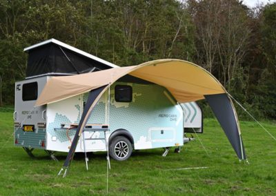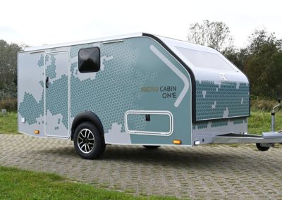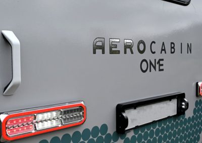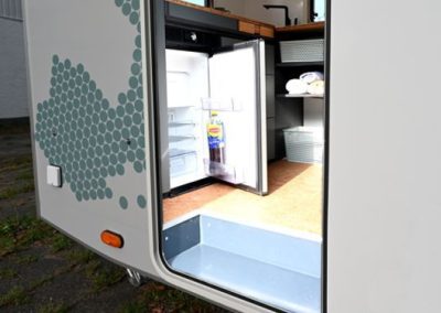 Eine breite Tür und ein niedriger Einstieg sind bei wenigen Caravans zu finden, waren jedoch ein wichtiger Entwurfspunkt bei der Entwicklung der Aero Cabin. Dank der breiten Tür kann man bequem ein- und aussteigen, und der niedrige Einstieg ermöglicht es, ohne eine Stufe hineinzugehen. Besonders praktisch ist der Kühlschrank: Von außen kann man schnell eine Erfrischung holen, und wenn man einmal drinnen ist, ist der Kühlschrank über den rechten Griff erreichbar.