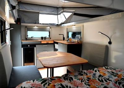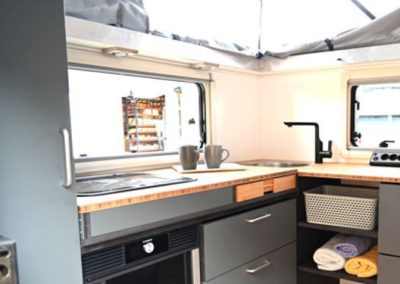 In der Aero Cabin One findest du eine großzügige Eckküche, die mit allem ausgestattet ist, was du benötigst. Die Küche hat einen luxuriösen 3-Flammen-Gasherd, eine Besteckschublade, ein großes Spülbecken mit Wasserhahn und einen Kühlschrank. Durch das offene Design hast du einen guten Kontakt zur Außenwelt und zu den Gästen am Tisch. Vom Arbeitsbereich aus blickst du durch ein Panorama-Fenster nach draußen, das komplett mit Netz ausgestattet ist, sodass eine angenehme Brise hereinströmt. Der Dometic-Kühlschrank ist besonders praktisch, da er an beiden Seiten scharnierbar ist, sodass du sowohl von innen als auch von außen Zugang hast. Der Kühlschrank bietet ein großzügiges Volumen von 65 Litern, einschließlich eines Gefrierfachs. Darüber hinaus sorgen sechs kugelgelagerte Schubladen, ein Kleiderschrank und viel zusätzlichen Stauraum dafür, dass das Interieur perfekt organisiert ist. So kann ein kleiner Wohnwagen überraschend groß wirken!