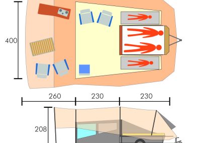 Der Tourist zeichnet sich durch das Wort „Panorama-Ansicht“ aus. Dieser Faltcaravan bietet einen Ausblick in alle Richtungen, ohne Kompromisse bei dem charakteristischen Smitveld-Design einzugehen. Das geräumige große Vorzelt mit viel Stehhöhe bietet Platz für die ganze Familie, und das Besondere an diesem integriertes Vorzelt ist, dass keine Stangen in der Mitte stehen. Dadurch entsteht die Freiheit, Stühle und Tische nach Belieben zu platzieren, was den Zeltaufbau flexibel und praktisch macht.